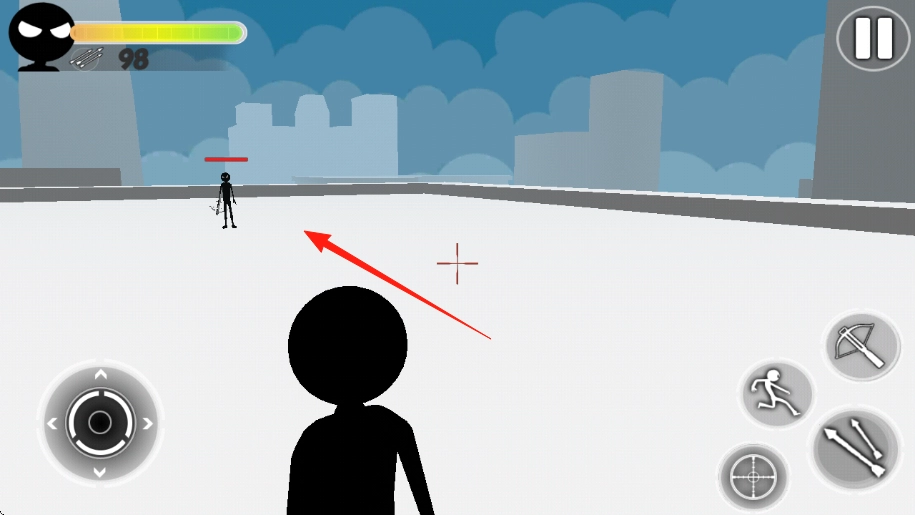 在简洁的视觉设定下,纯白色背景过滤掉了多余元素,使玩家能将注意力完全投入到搜寻敌人、瞄准射击的核心操作中,同时也让火柴人敌人的动作变化与弩箭的飞行路径更清晰可辨。