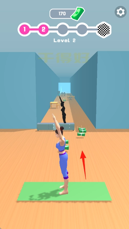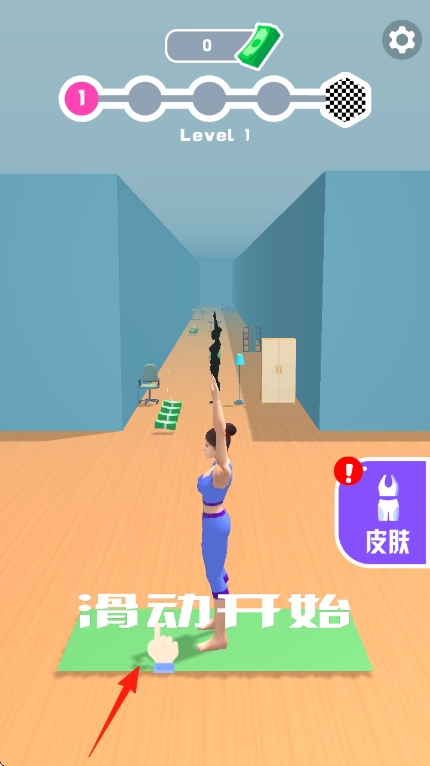操作流程为“滑动开始”,通过控制瑜伽角色,在“Level1”的室内场景中,借助站立、倒立等瑜伽动作向前移动,并收集绿色钞票。