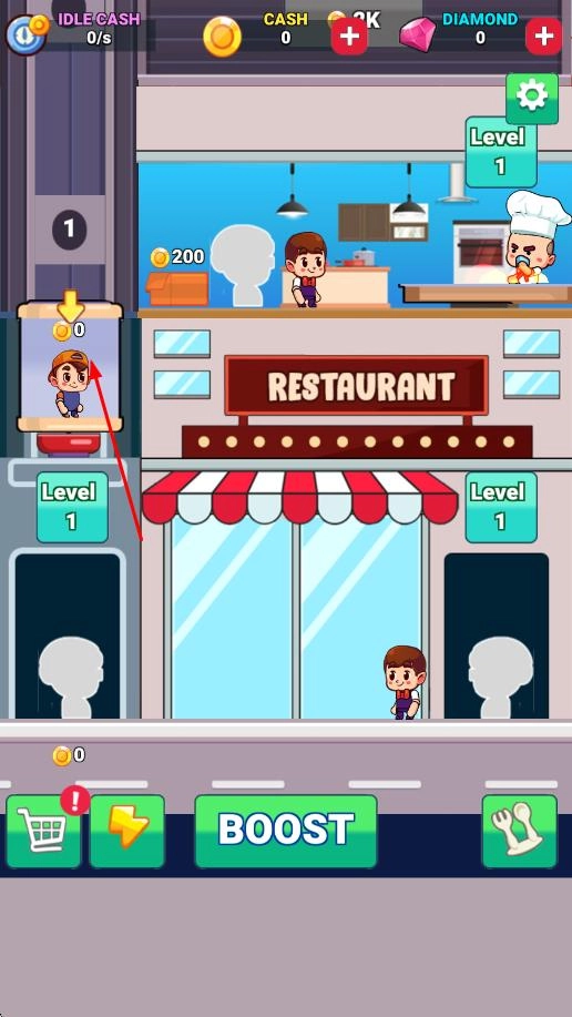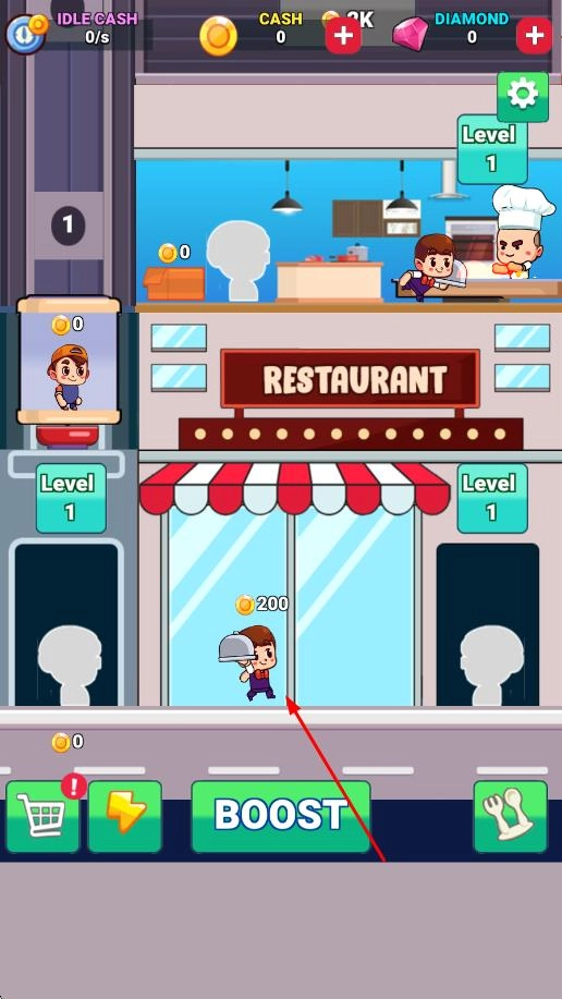 进入游戏后,先在初始餐厅里放置好基础灶台和餐桌,接着点击食材图标来解锁第一道菜品,之后开启自动烹饪模式。