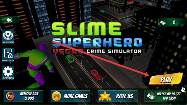 在游戏主界面,点击【PLAY】按钮,即可进入《Slime-Superhero》游戏,开启这场维加斯犯罪模拟主题的冒险之旅。