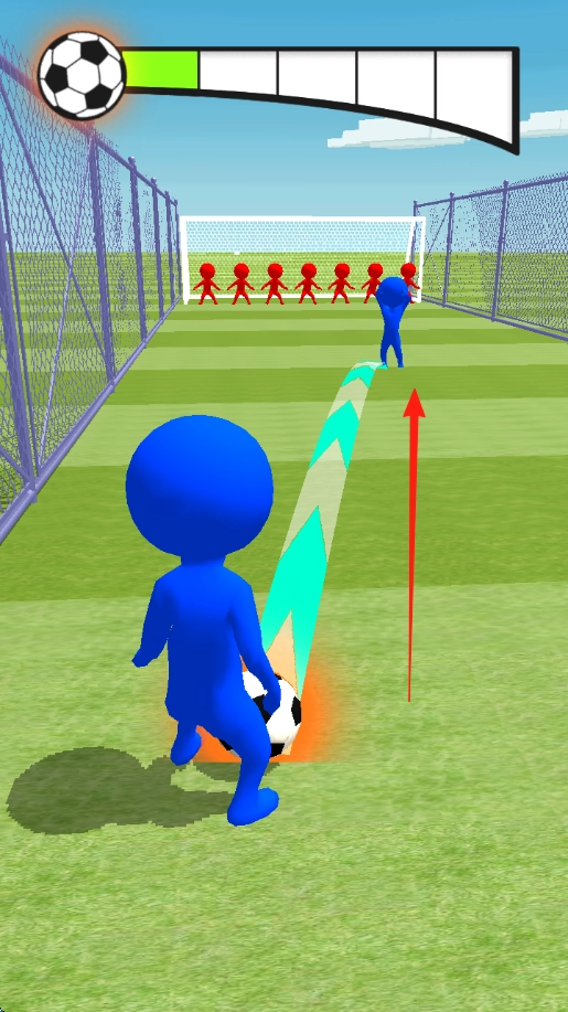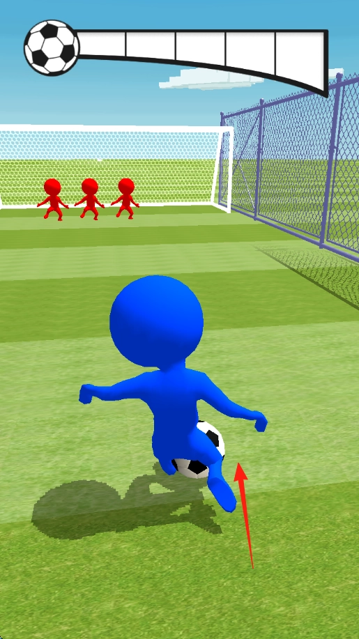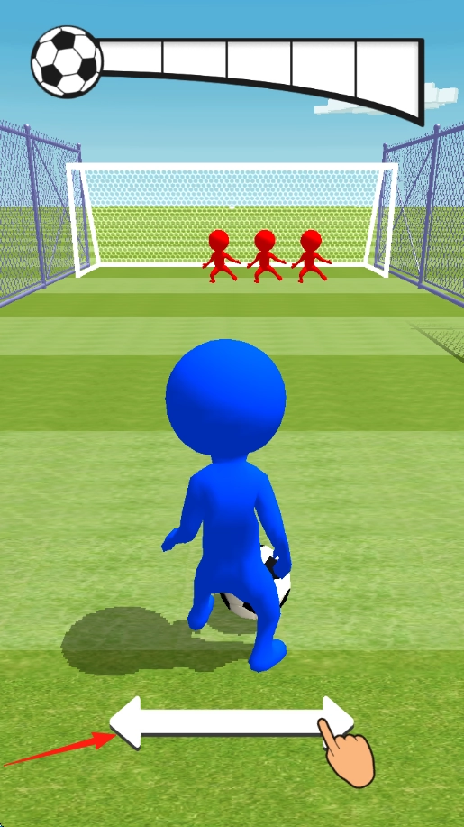 你需要操控蓝色小人来控制足球,通过左右滑动屏幕来调整方向,躲开红队3名防守队员,然后做好射门准备,界面上还能看到足球能量条。
