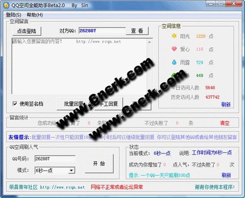 主要功能有: 1.批量刷留言。 2.刷人气 3.有4种刷人气模式 4.快速查看QQ空间信息 5.一个QQ限制1天只能刷100点