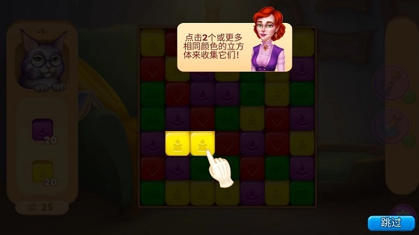 来学习消除技巧吧:要达成关卡目标,就得收集更多方块。要是点击5个连在一起的方块,就能做出“火箭”;点击7个的话,就能做出“炸弹”。不同的排列方式,还会触发各种各样厉害的消除效果呢。