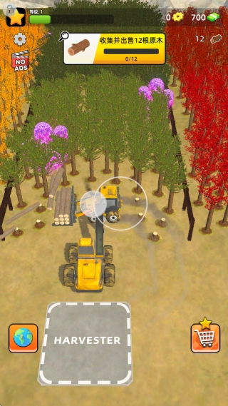 接下来会进入砍伐模式,请留意画面上方的任务提示,操控伐木车砍伐12棵树木就可以了。