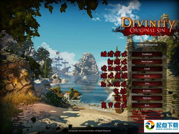 随后就是进入到《神界3:原罪》的主菜单当中,第一项是“继续游戏”(如果初次游戏,此位置为灰色,无法按动。以后进行游戏都从这儿进入)、第二项是“新游戏”(开启新游戏都从这儿进入);