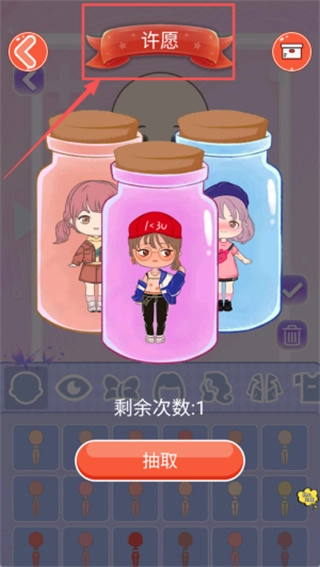 当你进入许愿界面,看到粉色、紫色、蓝色三个罐子后,点击那个橙色的“抽取”按钮,系统就会随机从其中一个罐子里为你分配一个卡通角色。