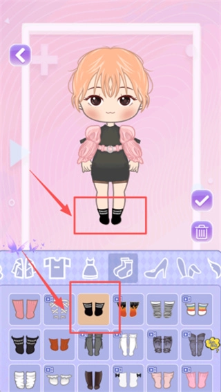 当你想更换袜子时,先点击页面下方的袜子图标,接着在出现的选项里挑选一双黑色袜子,只需点击一下,女孩脚上原本的袜子就会被替换成这双黑色袜子了。
