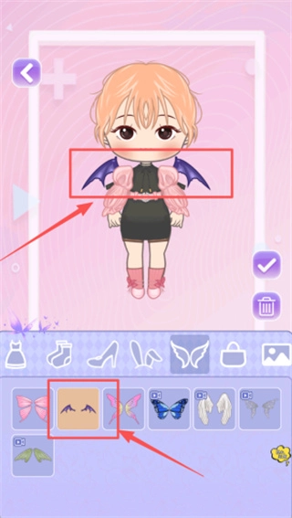 若想为女孩添上翅膀,只需点击下方的翅膀图标,挑选一对紫色翅膀,再点击“确认”按钮,翅膀便会自动装到女孩的背上。