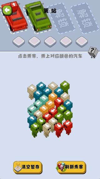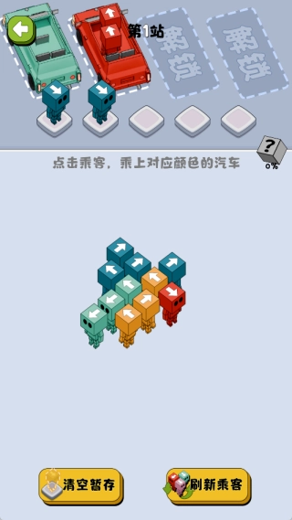进入关卡后,留意乘客头顶箭头的指向以及汽车的颜色,确认每位乘客对应的目标车辆,初步建立调度的认知。
