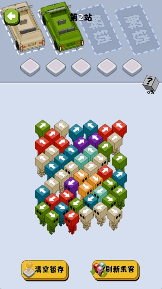 当所有乘客都顺利登上对应颜色的车辆后,本关卡即可通关,随后能解锁难度递增的后续关卡,以此不断考验玩家的调度能力。