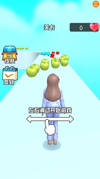左右滑动屏幕操控角色,开启跑酷之旅。途中需避开红苹果等障碍,同时收集各类道具,以此推进关卡进度。