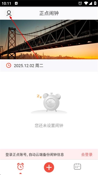 1、打开正点闹钟APP,在首页左上角找到个人图标并点击,即可进入“我的”页面。