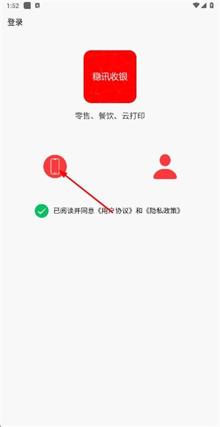 1、进入稳讯收银点击手机图标,进入短信登录页面。