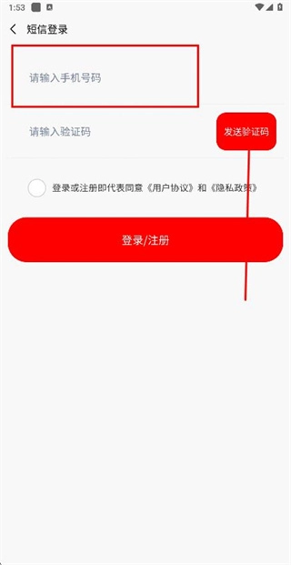 2、在短信登录界面输入手机号码,勾选相关协议后,点击“发送验证码”按钮。