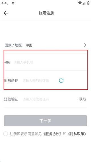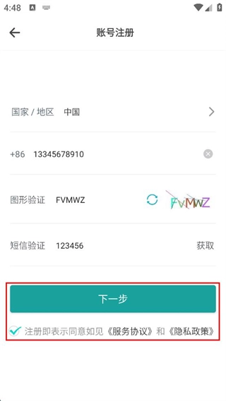 4、勾选注册即表示同意如见服务协议和隐私政策,点击下一步按钮。
