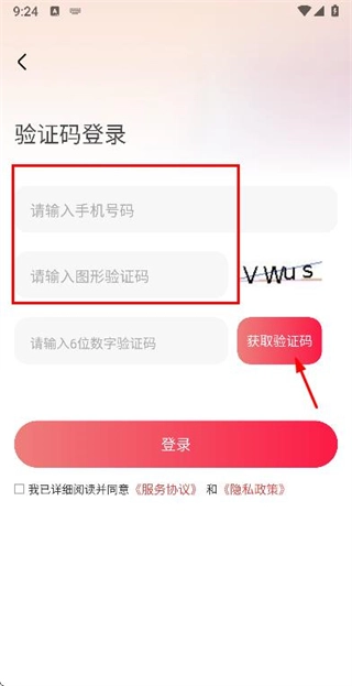 在手机登录页面,先填写手机号和图片验证码,接着勾选相关协议,最后点击“获取验证码”按钮。