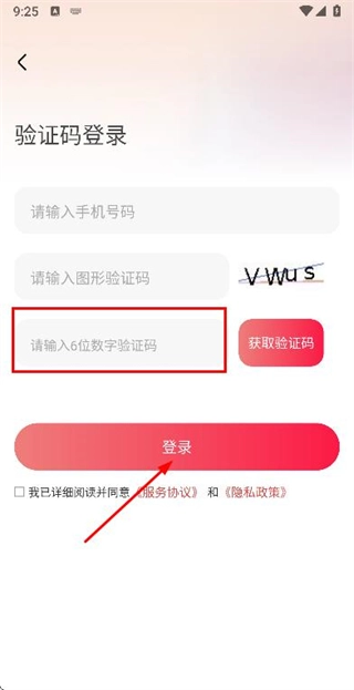 在验证码输入框内填入收到的验证码,随后点击登录按钮,以此完成账号的登录流程。