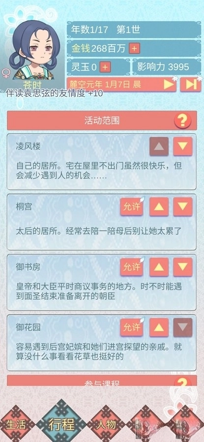 这个情况比较特殊,旁人能力再强也没法教,第一世只能依靠母后(第二世可以参与弟弟相关的事件)。建议把所有活动范围都限制住,或者只开放一两个,同时把桐宫(也就是母后的住所)设置在最优先的位置,亲近的人里只保留母后,这样就能触发母后的教导,谋略值也会快速提升。