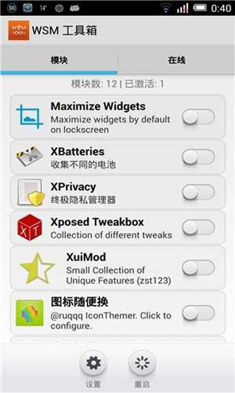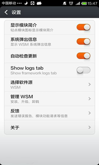 WSM工具箱(WSM tools)是MIUI上的Xposed框架,可以在不修改APK的情况下影响程序运行(修改系统)的框架服务,基于它可以制作出许多功能强大的模块,且在功能不冲突的情况下同时运作。【功能说明】