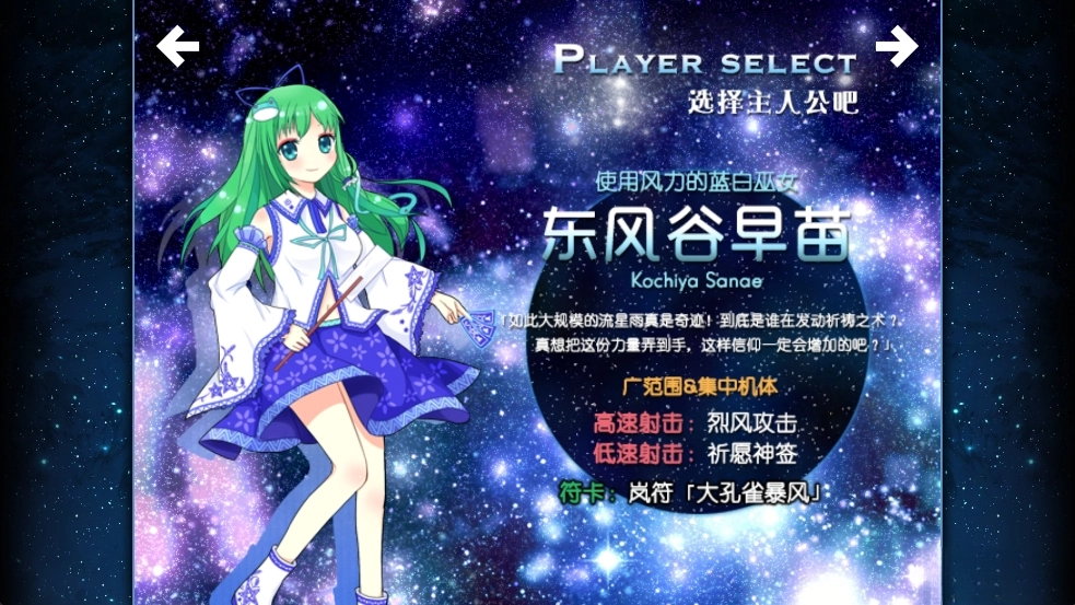《东方夏夜祭》属于二次元风格的弹幕射击游戏,设有天狼星、大角星、织女星、牛郎星等多个难度可供挑战,提供四个美少女角色供玩家选择。在游戏中,玩家需灵活操控角色移动以避开全屏弹幕,还能释放各类技能攻击敌人,同时可挑战众多不同的BOSS。