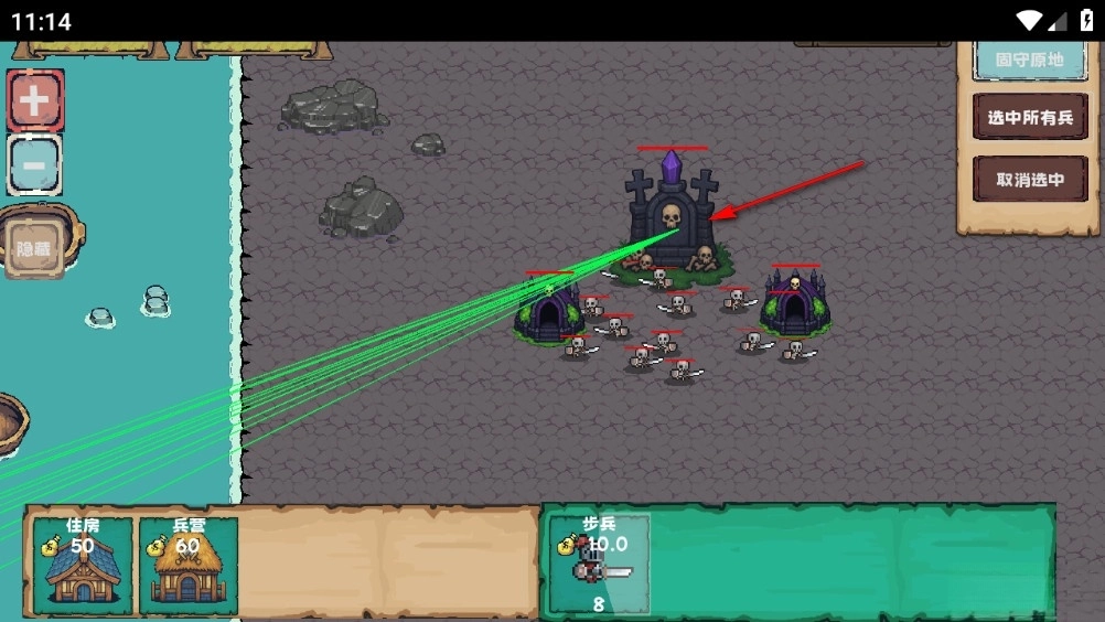 你可以操控生成的士兵,指挥他们向敌方基地发起进攻,只要敌方基地被毁坏,你就获得胜利。