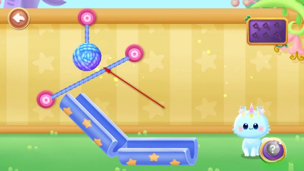 宝宝来分析一下:小猫在毛线球的正下方,所以只要先剪断旁边两根绳子,把控好方向,最后再剪断中间那根绳子,毛线球就能准确落到小猫身旁啦!快来尝试一下!