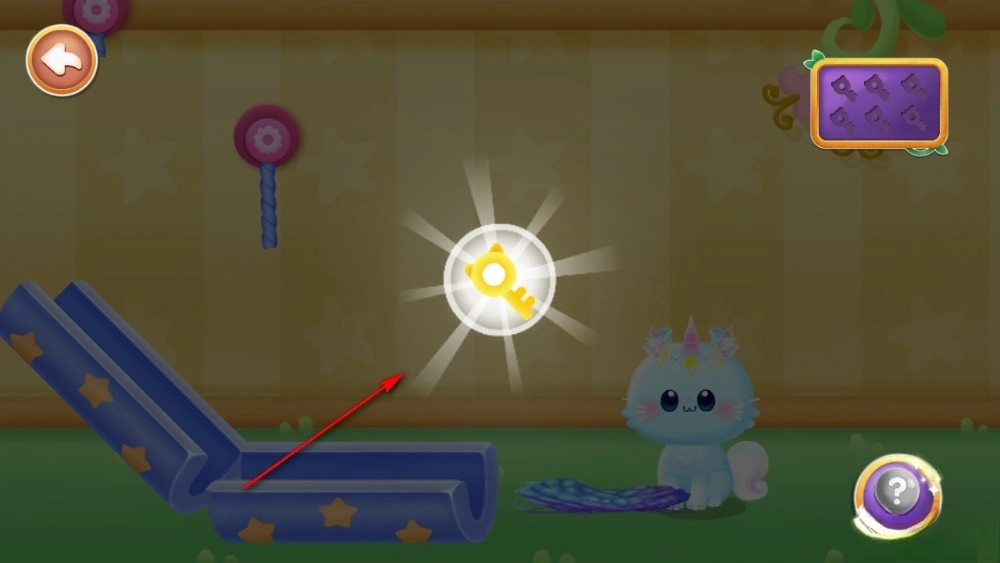 哎呀,有只猫精灵迷了路,还把回家的钥匙弄丢了,这可怎么好呢?宝宝先看看地图:钥匙就在雪人右边呢。那咱们来规划下路线,让猫咪先拿到钥匙吧。