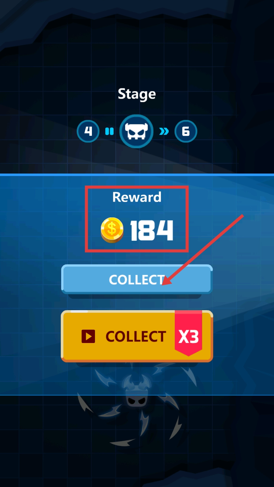 完成关卡后,点击【COLLECT】按钮领取【Reward-184】对应的金币奖励,通过积累这些资源可以用于角色培养或技能升级,从而更好地应对后续的关卡挑战。
