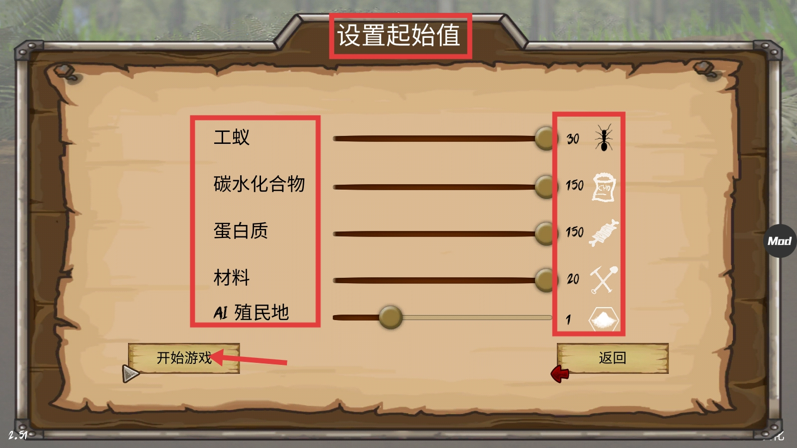 在【设置初始值】界面,对【工蚁数量】【碳水化合物储备】【蛋白质存量】等参数进行调整后,点击【启动游戏】按钮,即可完成蚁群模拟的初始配置。