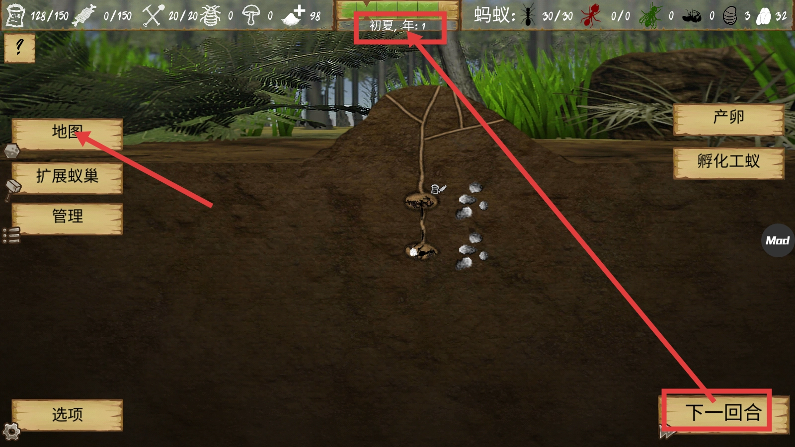进入游戏后,点击【地图】,留意【初夏-年:1】的时间进度,点击【下一回合】推动游戏进程,逐步发展蚁群。