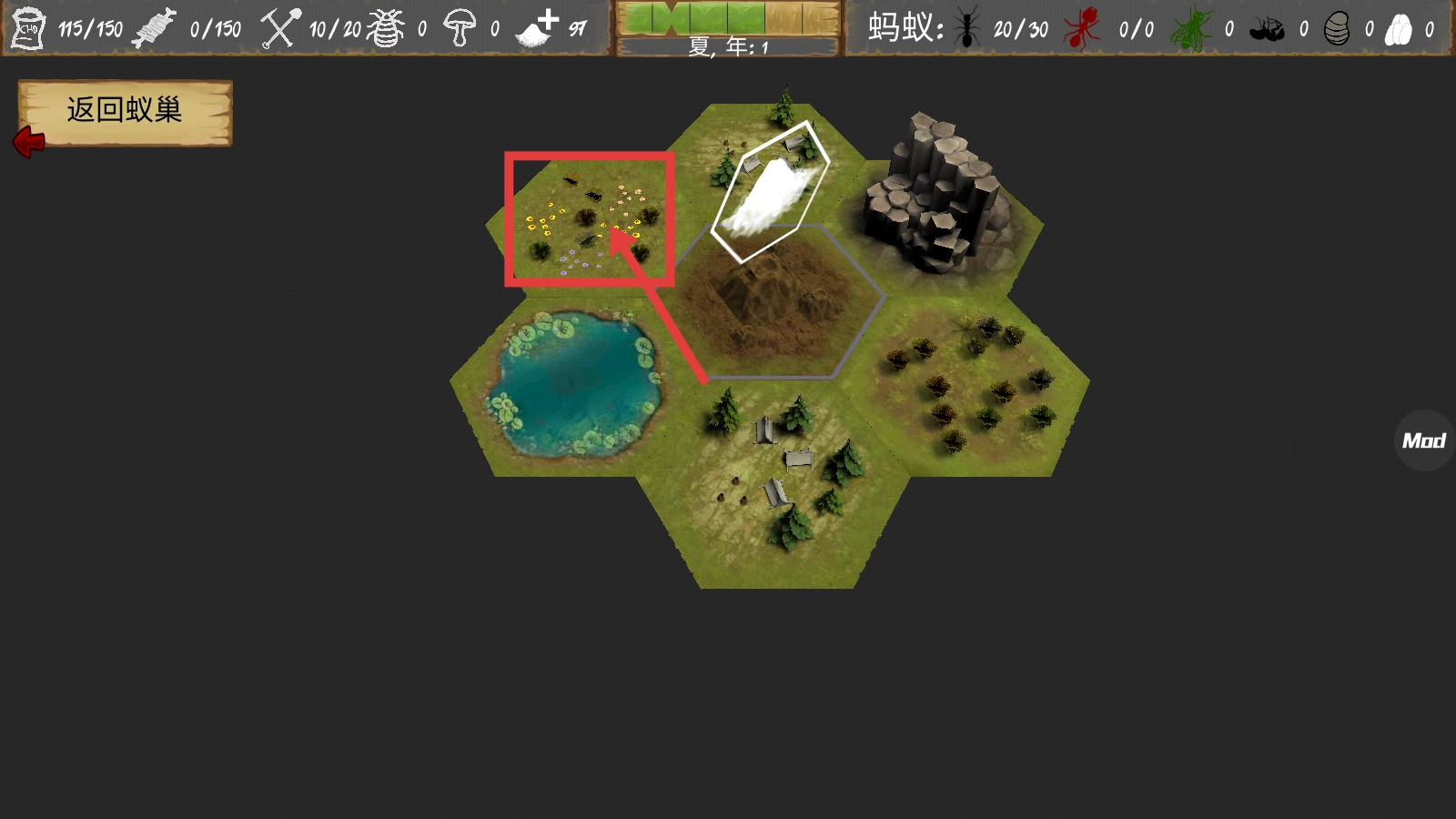 在地图界面里,挑选带有花朵的区域,安排工蚁去进行探索,收集资源,为蚁巢的扩张与发展储备物资。