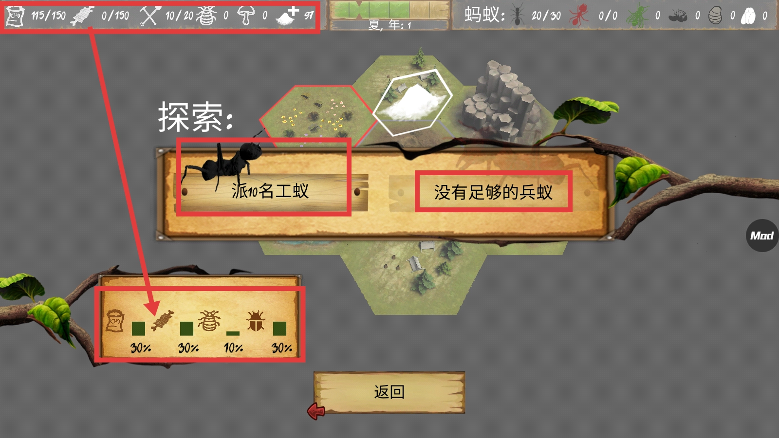 派遣【10名工蚁】去执行任务,按照【碳水化合物占比30%】这类资源比例来规划探索行动,另外要留意【兵蚁数量不足】的提示,一旦出现就及时补充兵蚁。
