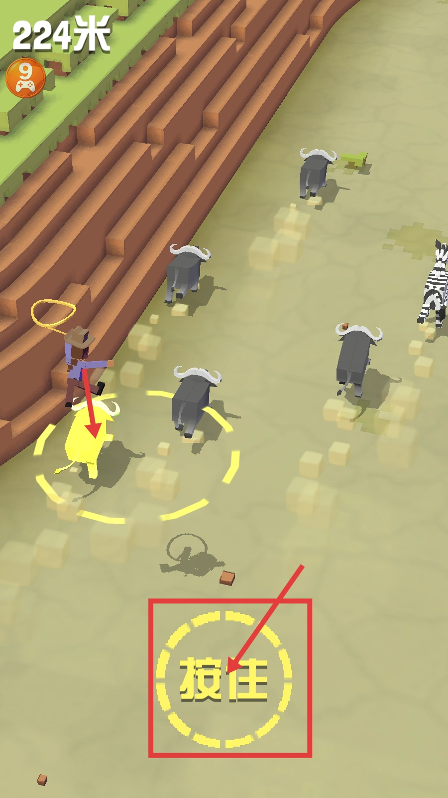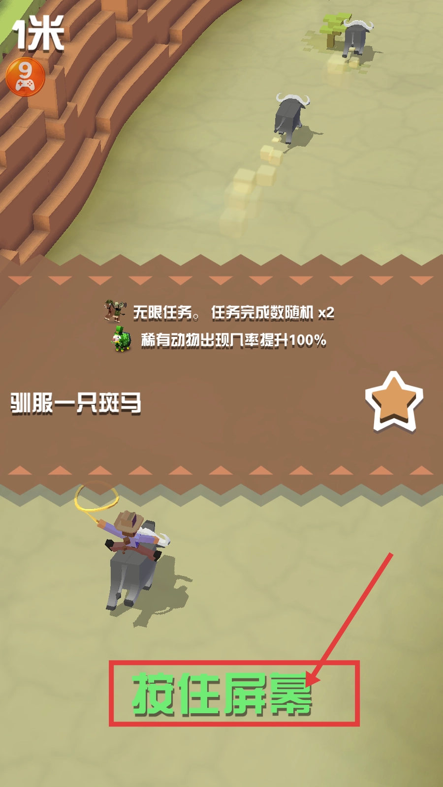 接取【驯服一只斑马】任务后,借助【任务完成数随机翻倍】与【稀有动物出现几率提升100%】的增益效果,按照提示【按住屏幕】来启动驯服操作。