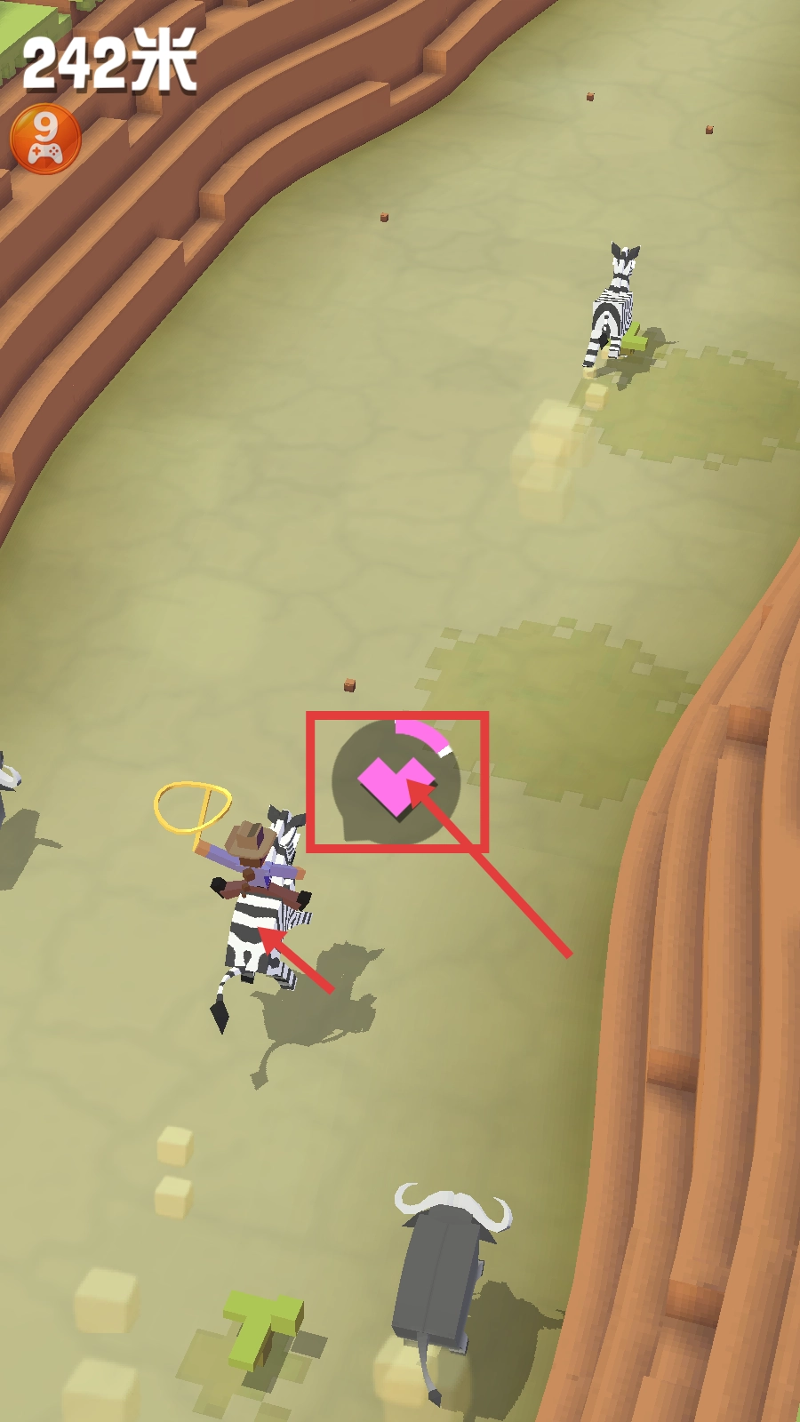 在驯服斑马时,请注意观察粉色进度条,保持操作直到进度条走完,这样就能顺利把斑马变成你的坐骑了。