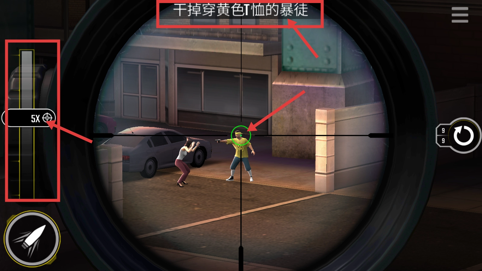 在狙击界面中,使用【5倍】倍率瞄准身着黄色T恤的暴徒,务必锁定目标。