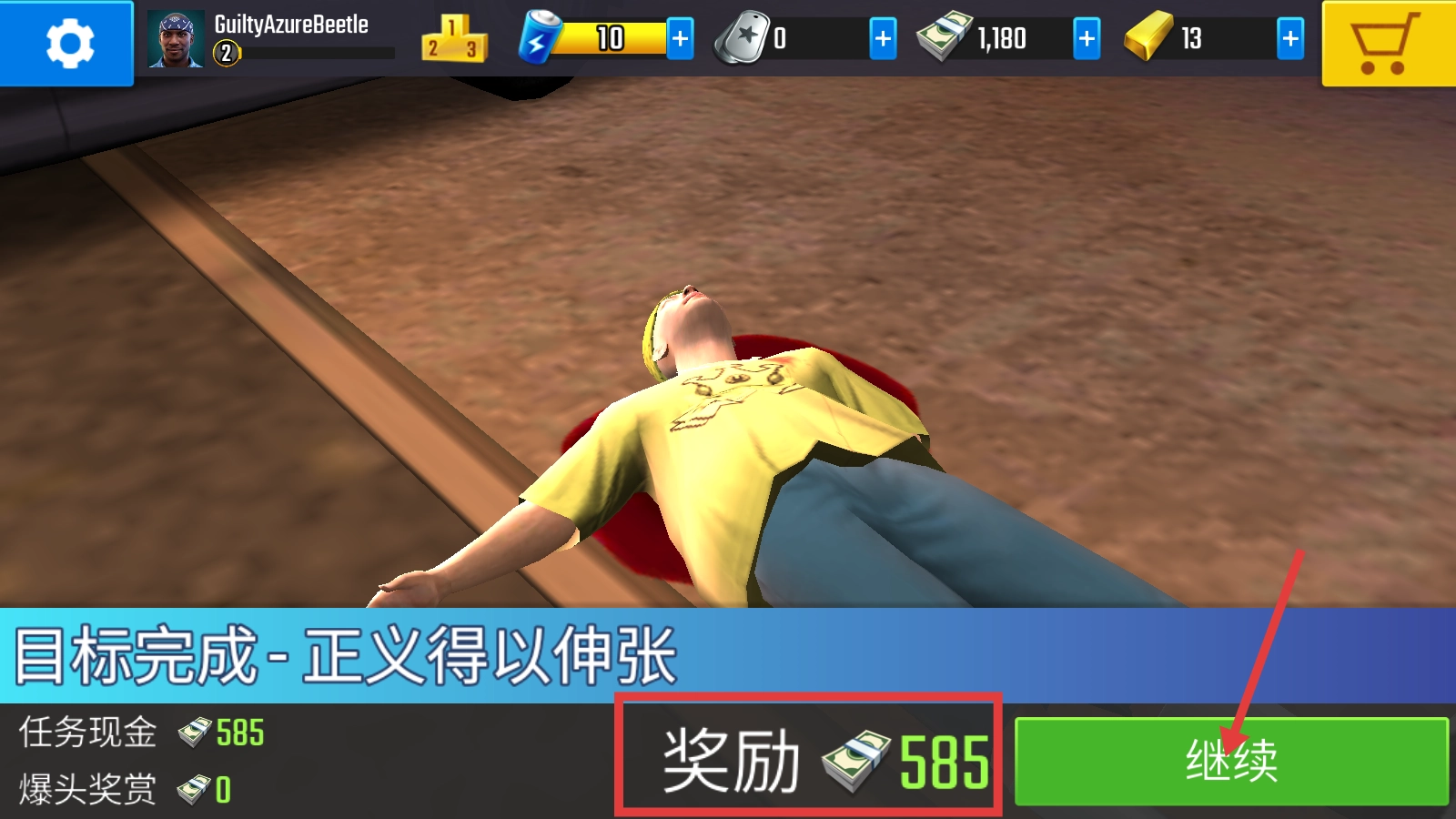 任务完成后,领取【奖励-585】现金,点击【继续】开启下一段冒险。