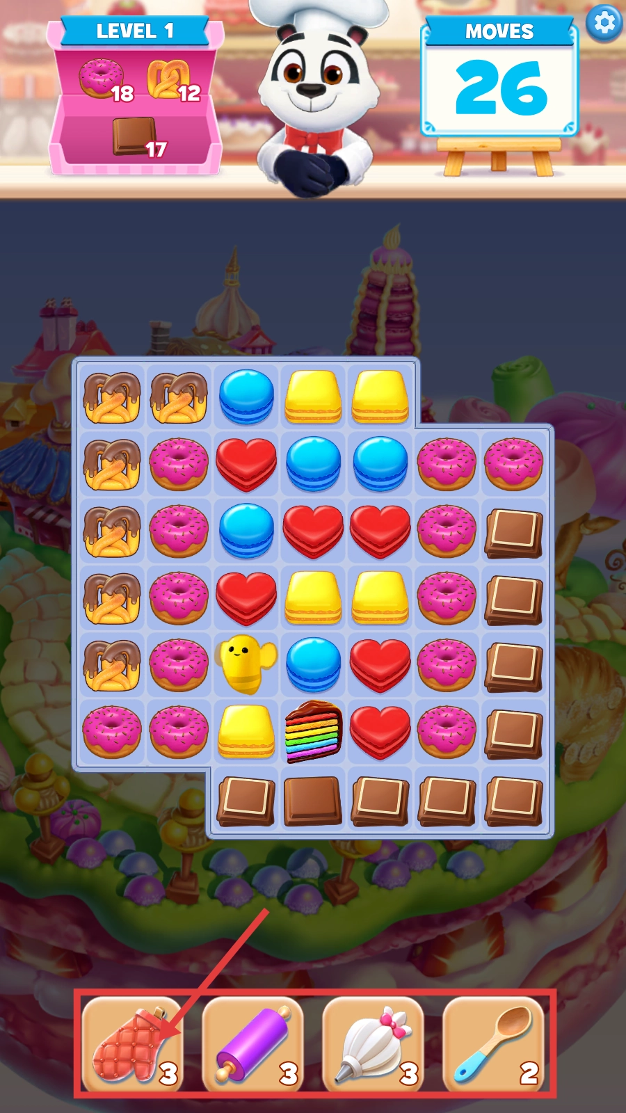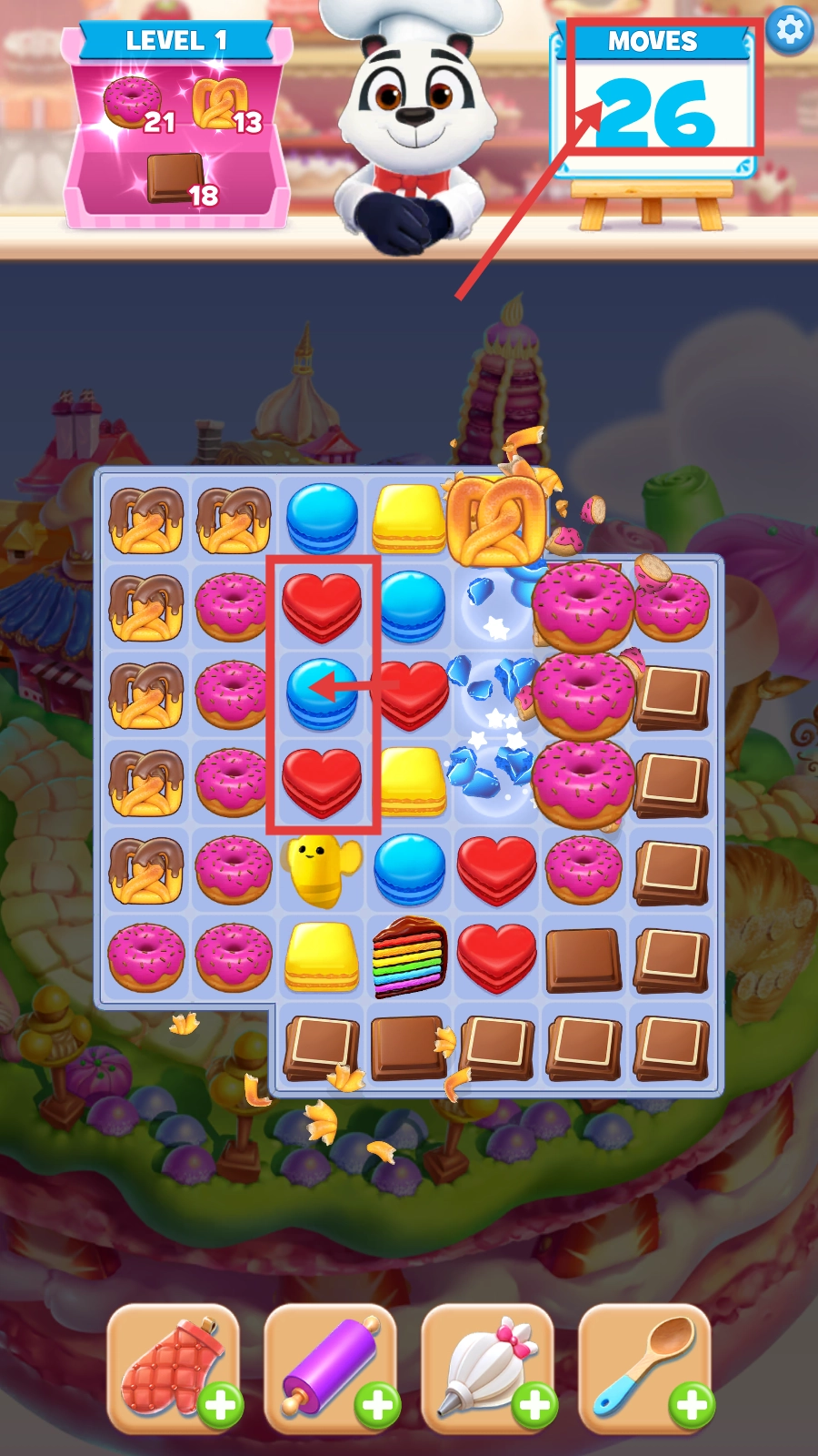 关注【MOVES-26】的剩余步数,通过组合消除心形、马卡龙等元素,快速削减目标物品的数量,从而推动关卡进度。