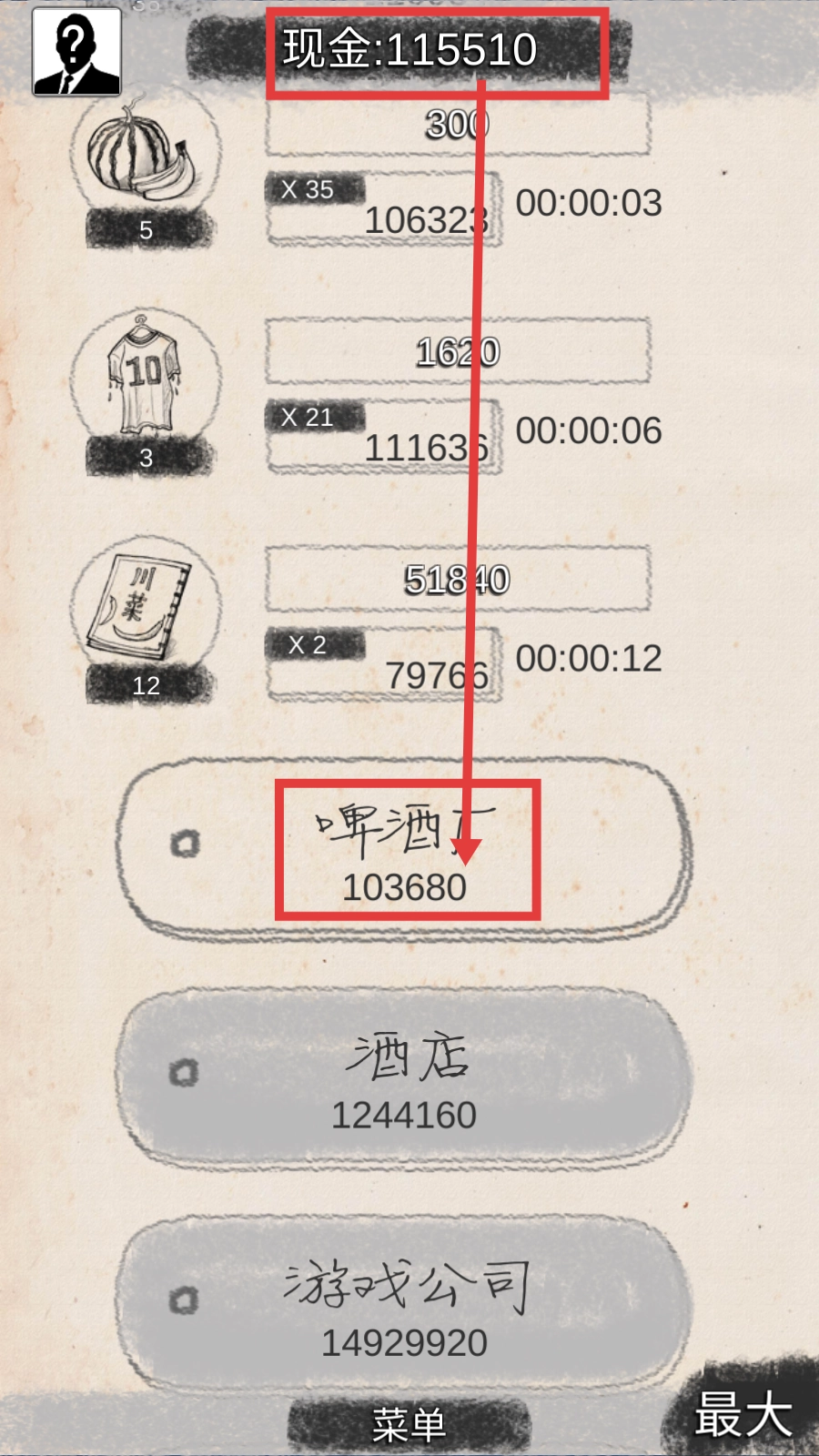 当现金储备累积到115510时,可投资【啤酒厂-103680】项目,以此拓展高收益产业的布局规模。