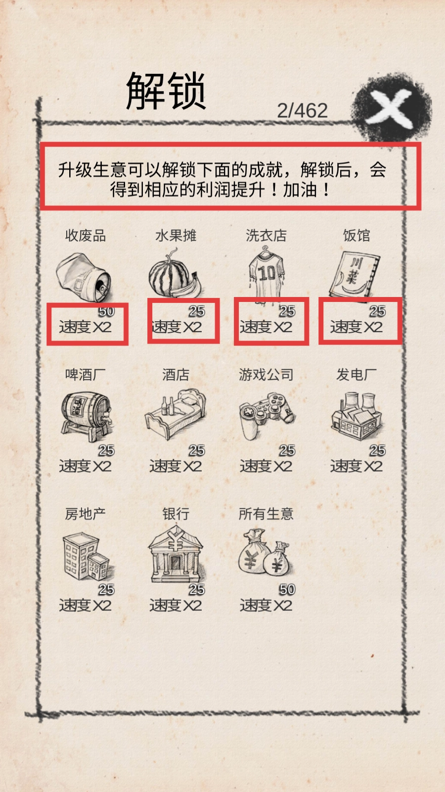 升级“收废品”“水果摊”等生意以解锁成就,就能获得“利润速度×2”的提升效果,为产业发展提供助力。
