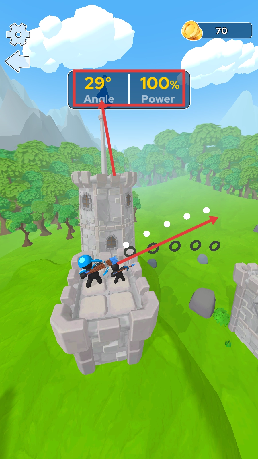 调整【角度-29°】与【力度-100%】,精准把控箭矢飞行轨迹,锁定敌方城堡内的人员,提高射击命中效率。