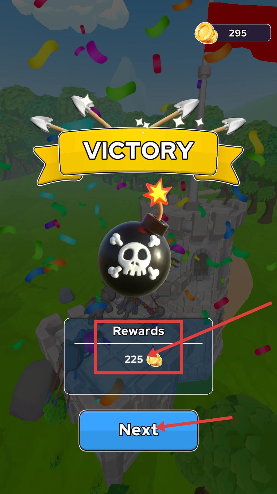 战斗获胜后,可领取【Rewards-225金币】,点击【Next】按钮进入下一关,所获资源可用于后续的升级与强化。