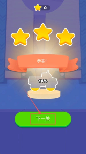 弹出「恭喜!14%」的提示后,点击「下一关」按钮,就能马上进入难度更高的地图。
