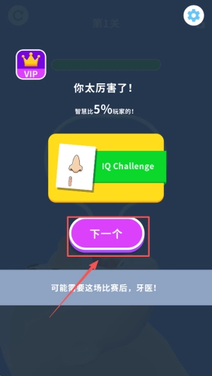 然后,要是屏幕上弹出写着“VIP 你太厉害了!智慧超过5%玩家的!”的恭喜界面,就说明你已经突破了瓶颈,可以点击继续去挑战更高难度了。