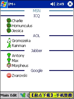 IMPlus V4.45.PPC 汉化版 IM+®《移动即时通讯》支援时下最流行的即时通讯服务: MSN®, Yahoo!®, AOL™, ICQ®, Google® Talk和Jabber®。它可以让您随意地、省钱地、即时地转换即时通讯服务。