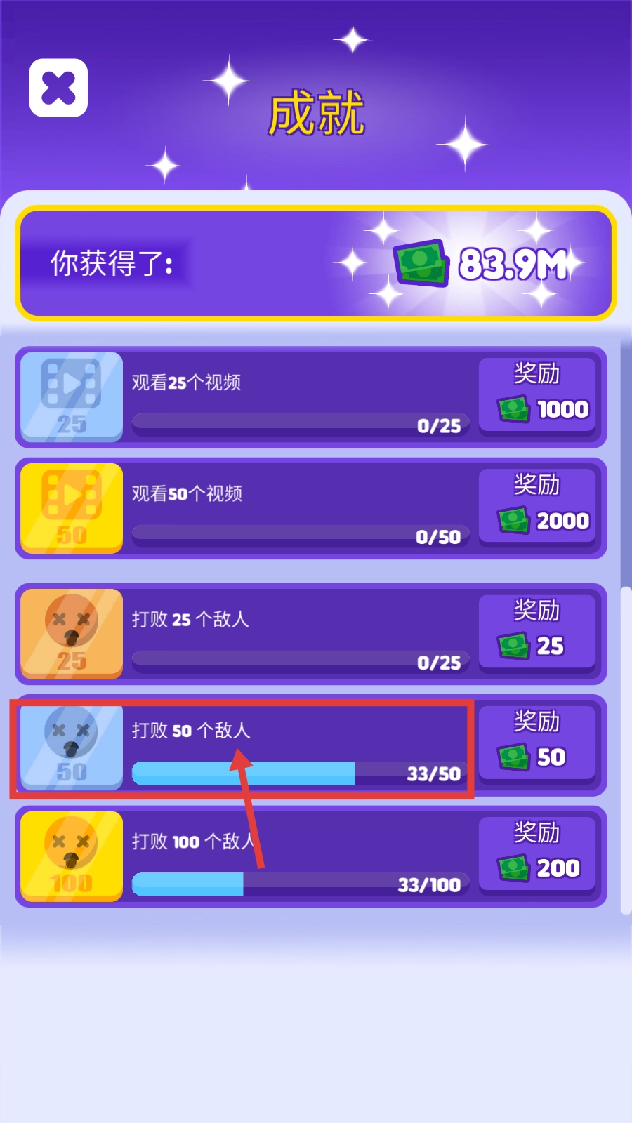 可以多留意“击败50个敌人”这类成就(目前进度是33/50),达成后能得到钞票奖励(像击败50个敌人就给50钞票),不断推进成就进度有助于提高资源获取效率。