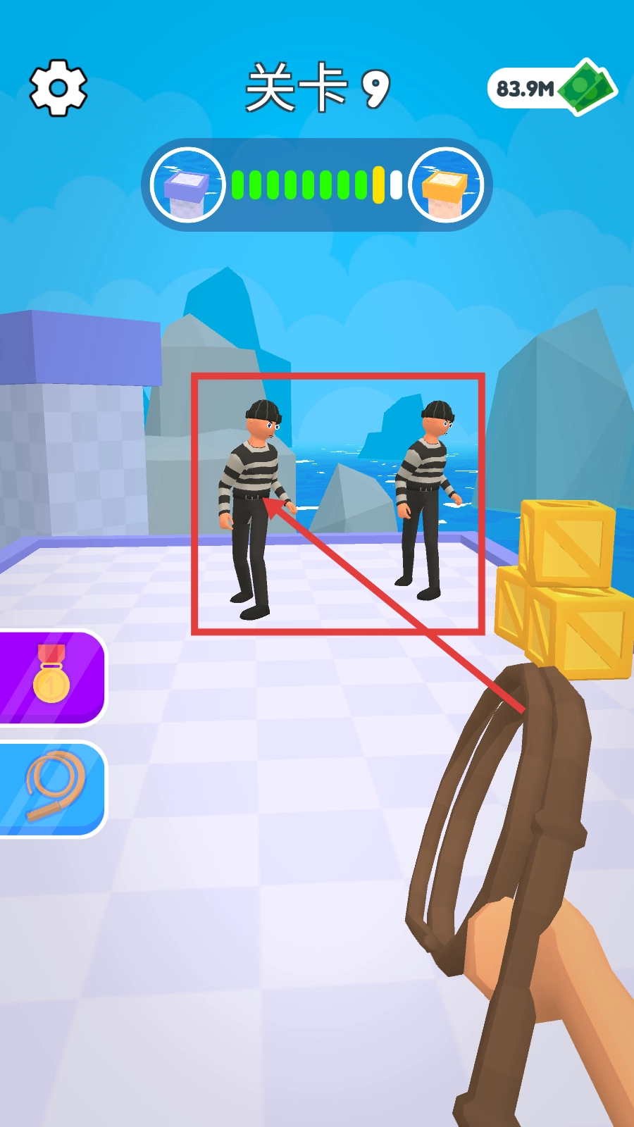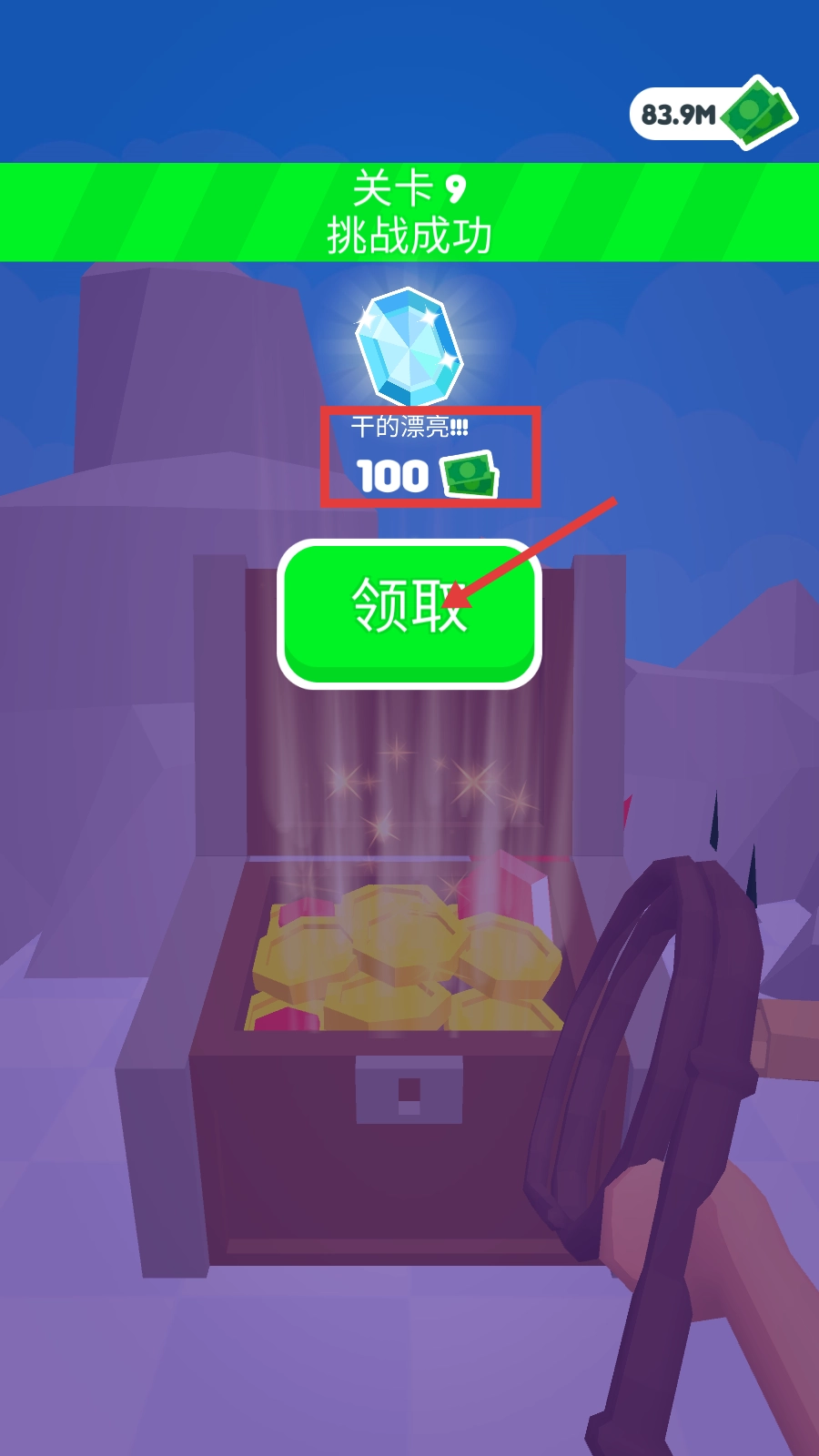 在关卡9挑战成功后,你将获得100钞票奖励。请点击“领取”按钮来积累这些资源,这些资源可用于升级绳索道具或解锁新的关卡内容。