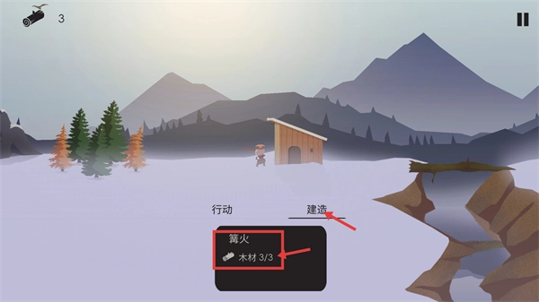 当木材收集数量达到【木材3/3】时,点击【建造-篝火】选项,就能完成篝火的建造,为生存提供温暖与基础保障。