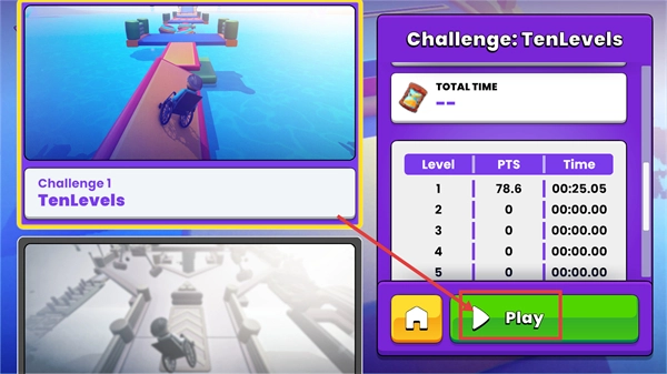 在【Challenge:TenLevels】界面,点击绿色的【Play】按钮,即可开启十关轮椅挑战,还能查看关卡记录,进而启动游戏进程。