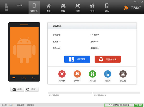 首先,安装最新版的游戏狗手游助手PC版,安装完成后,打开助手,用数据线将手机连到电脑上。