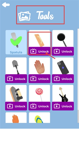 在【Tools】界面中,目前可以使用【Spatula】工具,点击该工具对应的【Unlock】按钮,就能解锁新的蛋糕装饰工具。